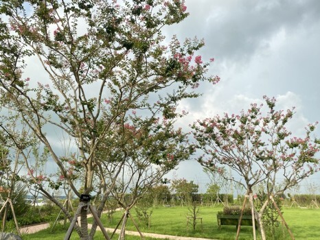 다양한 종류의 꽃들과 나무가 줄지어 있어