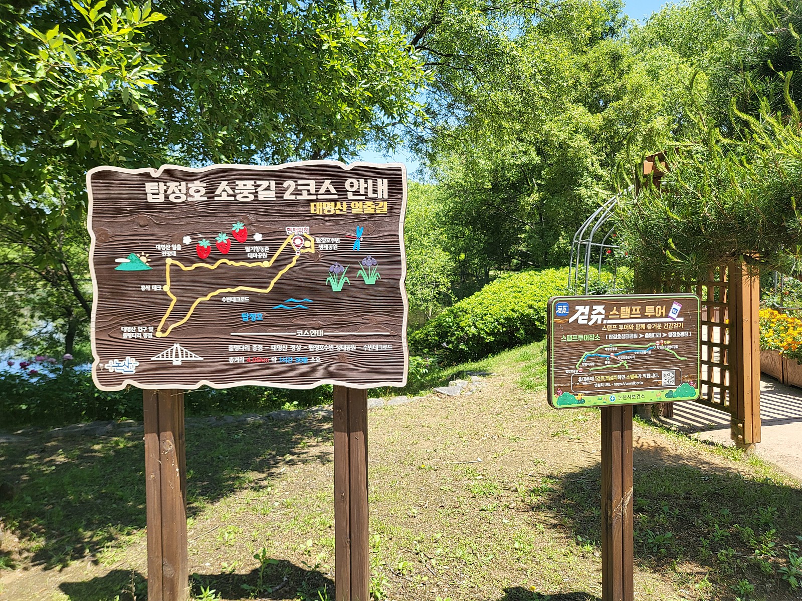 아름다운 둘레길로 소문이 나있는 소풍길 2코스를 걸어봤습니다. 출렁다리 종점에서 대명산 정상, 탑정호수변생태공원, 수변데크로드로 이어진 코스입니다. 총거리 4,05km, 쉬지 않고 걷는다면 약 1시간 30분 소요됩니다.