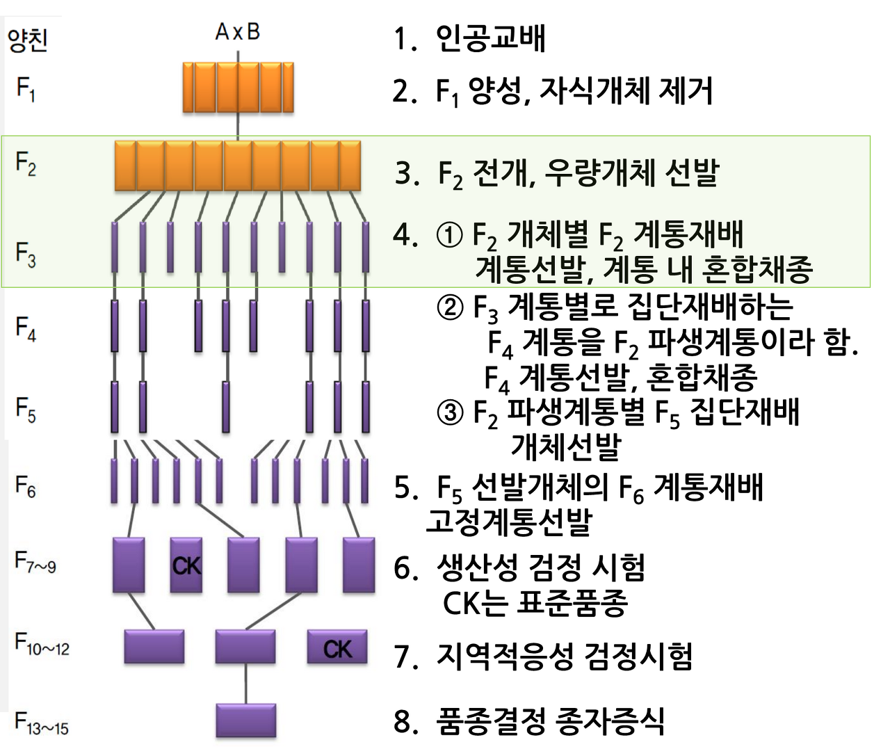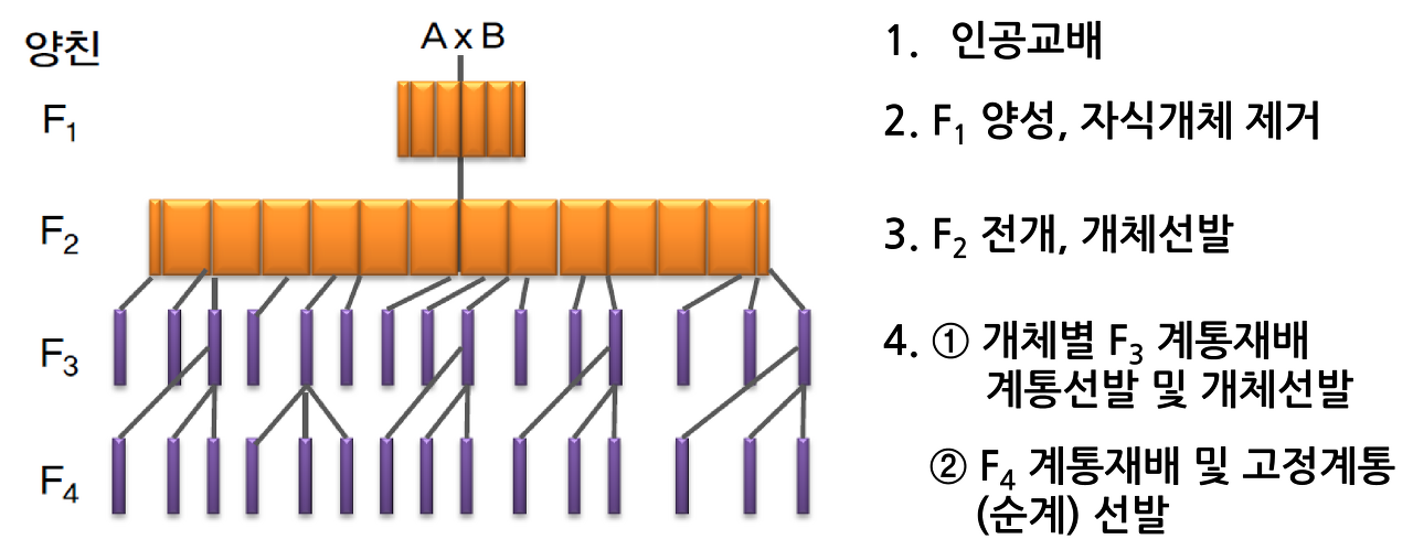 · F2, F3, F4 집단재배하고, F5 세대 계통재배한다.
