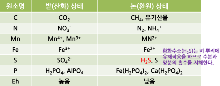 ① 담수재배 및 환원물질의 시용으로 토양 산화환원전위도, 즉 Eh의 저하, 황화물화를 꾀한다.