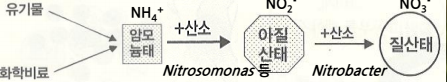 -질산화 작용은 NH4+에서 NO2−로 가는 1단계 과정에 관여하는 미생물은 Nitrosomonas, Nitrosolobus, Nitrosovibrio, Nitrosospira, Nitrosococcus 등 5가지이고, NO2-에서 NO3−로가는 2단계 과정에 관여하는 미생물은 Nitrobacter 이다.