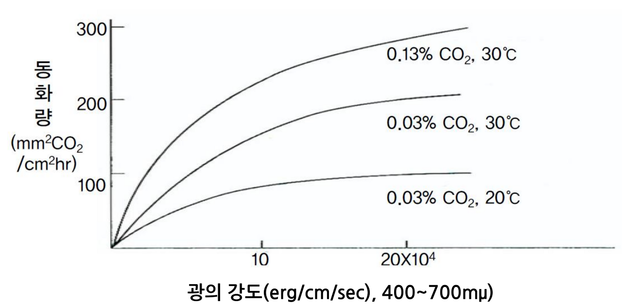 • 어느 농도에 도달하면 이산화탄소 농도가 그 이상 증가하더라도 광합성 속도는 그 이상 증가하지 않는 상태에 도달